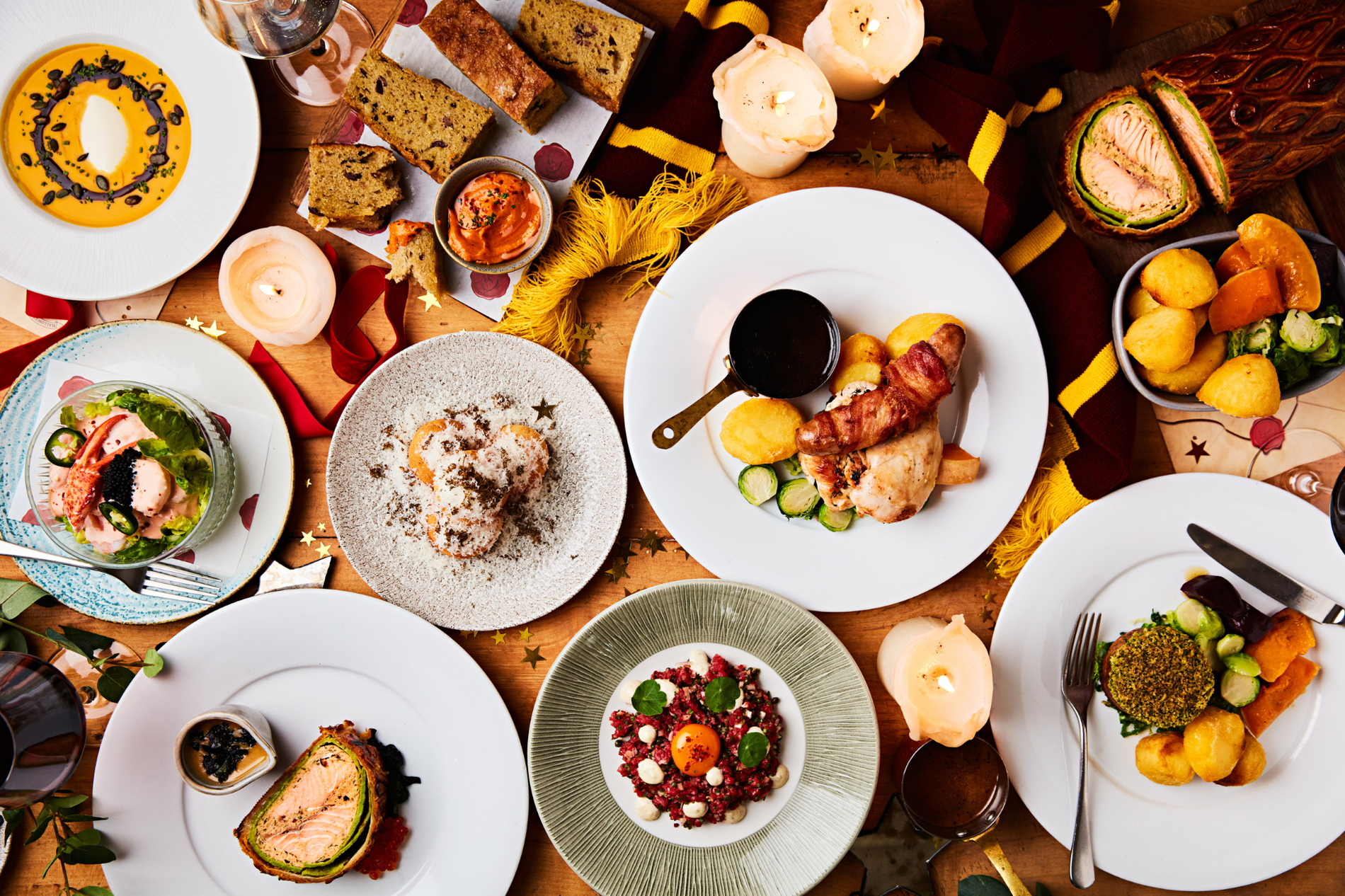 sausage stuffing, pigs in blankets, duck fat roasties, seasonal vegetables, gravy & cranberry sauce